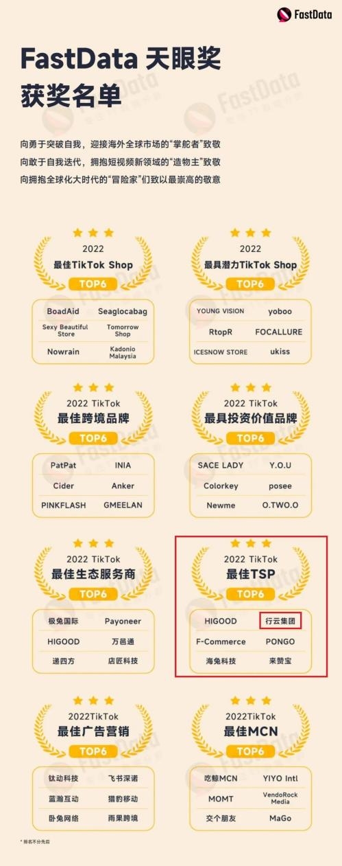 近日,第三方平臺FastData研究院正式發(fā)布了行業(yè)報告《2022年度TikTok生態(tài)發(fā)展白皮書》。同時,白皮書還同步發(fā)布TikTok生態(tài)首份第三方最具影響力的獎項TikTok天眼獎及TikTok生態(tài)圖譜。行云集團憑借2022年度在Tiktok出色的表現(xiàn)斬獲“最佳TSP”榮譽。