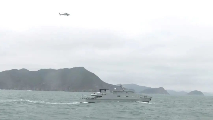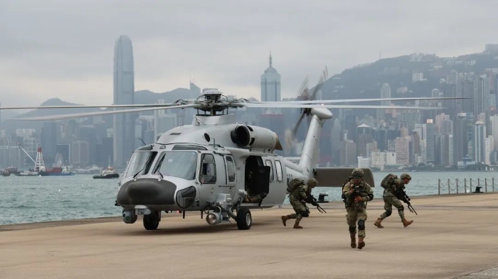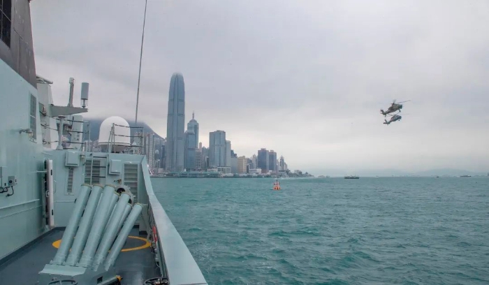 上午9時,昂船洲軍港上空警鈴驟響,接到出動命令后,駐香港部隊海軍艦艇緊急備戰(zhàn)備航,搭載特戰(zhàn)小隊駛離軍港。與此同時,空軍兩架直升機也從石崗營區(qū)緊急升空,協(xié)同執(zhí)行此次??章?lián)合巡邏任務(wù)。