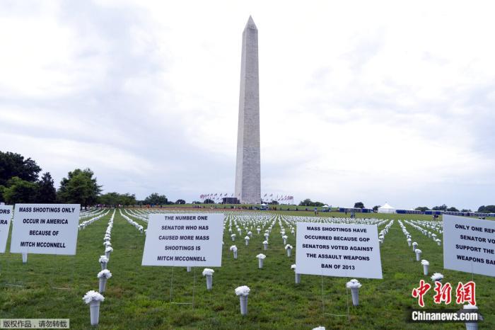 資料圖:2022年6月11日,在美國華盛頓紀念碑前舉行的“為我們的生命游行”集會期間,人們在槍支暴力紀念設施上放置標志牌,以支持槍支管制。