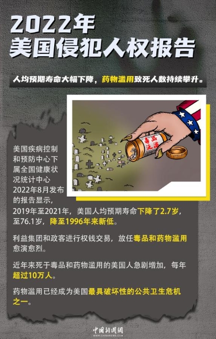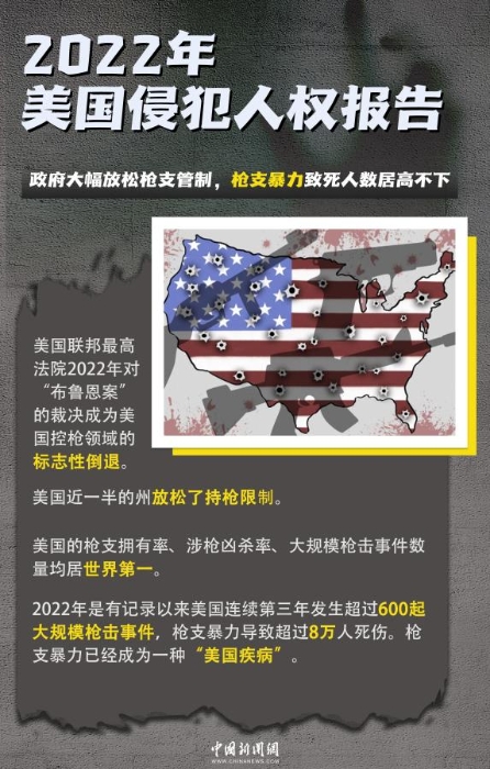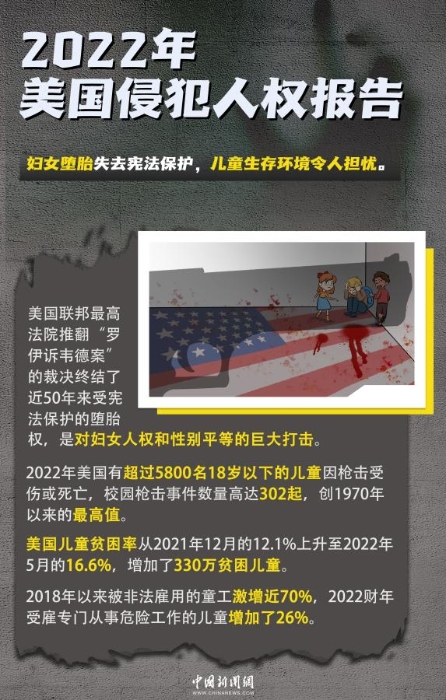 2022年,美國政府放松持槍限制,致使美國涉槍兇殺率、大規(guī)模槍擊事件數(shù)量高居全球第一;大搞政治獻(xiàn)金,“黑金”捐贈暗中操控選舉走向,大喊民主口號的選舉,實則失去了真實的民意基礎(chǔ);加劇種族對立,少數(shù)族裔遭受歧視日益嚴(yán)重,基于種族偏見的仇恨犯罪大幅增長;放縱權(quán)錢交易,為了蠅頭小利任由毒品禍亂四方,導(dǎo)致死于毒品和藥物濫用的美國人急劇增加;終結(jié)近50年來受憲法保護(hù)的婦女墮胎權(quán),不僅是對婦女權(quán)利和性別平等的置若罔聞,也是對兒童權(quán)益的深重打擊;亂揮制裁大棒,穩(wěn)坐單邊制裁的“世界之最”,對被制裁國家毫不留情,對當(dāng)?shù)孛癖娚钅魂P(guān)心;濫用軍事力量,在85個國家和地區(qū)開展軍事行動,導(dǎo)致近百萬無辜平民死亡……