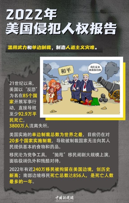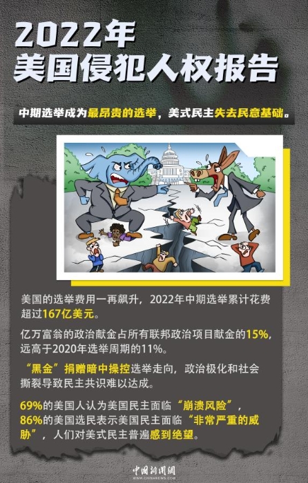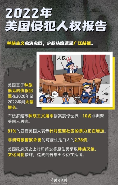 中新網(wǎng)北京3月29日電 (王續(xù)燃)近日,《2022年美國侵犯人權(quán)報告》正式發(fā)布,報告以七部分近兩萬字的詳實數(shù)據(jù)和內(nèi)容,揭開了美國披著“人權(quán)衛(wèi)士”、“人權(quán)燈塔”的羊皮,實際卻大行特行人權(quán)侵犯之實的真相。