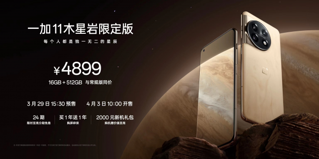 一加 11 木星巖限定版搭載第二代驍龍 8 移動平臺,滿血版 16GB 大內存,512GB 超大閃存,擁有內存基因重組技術、超幀超畫引擎、仿生振感馬達、游戲云計算專網四大領先配置,在內存管理、游戲畫質、馬達體驗、弱網游戲上打破安卓四大不可能,帶來安卓手機性能體驗新巔峰。目前一加 11 木星巖限定版已開啟預售,16GB+512GB 頂配 4899 元,至高 24 期分期免息,購屏碎保買一年送一年,4 月 3 日 10:00 正式開售。