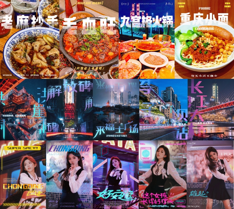 重慶的文化氣質既現代繁華,又極具神秘的江湖氣。在城市建筑上,立體都市、輕軌、老城交錯排列;在美食方面,重慶擁有老麻抄手、重慶小面、九宮格火鍋、毛血旺等熱辣美食;在方言上,巴適、安逸等方言語料頻頻出圈。此外,重慶更擁有碼頭文化、茶館文化、街頭文化等極富地域特色的巴渝文化……