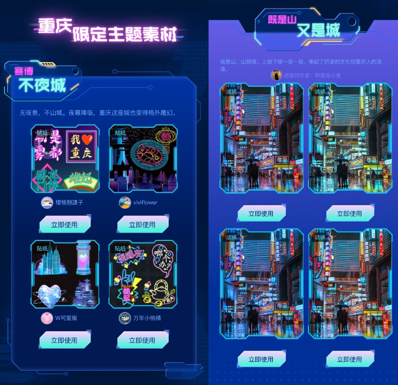 基于企劃,美圖秀秀也上線了重慶限定主題素材,色彩鮮明濃烈的貼紙以及高飽和高對比的城市濾鏡給予用戶更多自我發(fā)揮和創(chuàng)造的空間。
