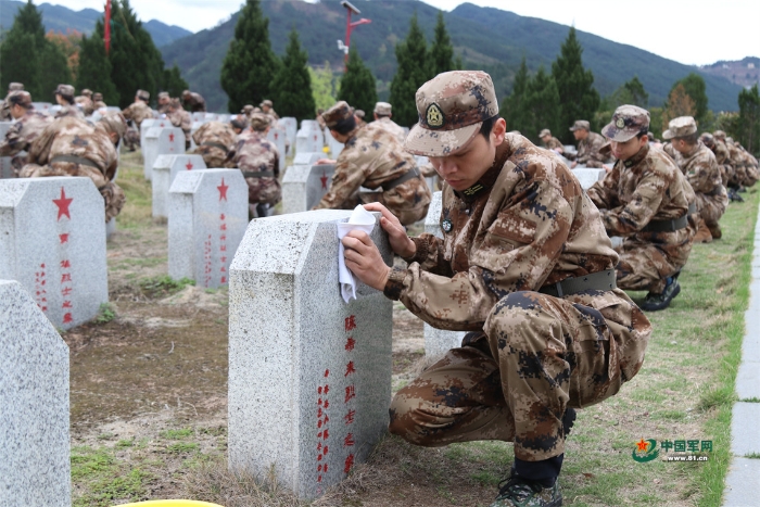 貴州省習(xí)水縣人武部官兵在青杠坡紅軍烈士陵園擦拭墓碑。何舜 攝