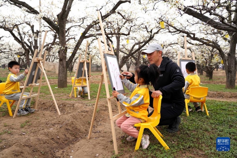 4月2日,老師指導(dǎo)小朋友在臨城縣北程村百年梨園寫生。