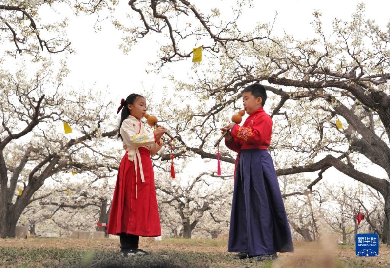 4月2日,在臨城縣北程村百年梨園舉行的梨花節(jié)主題活動上,小朋友吹奏葫蘆絲。