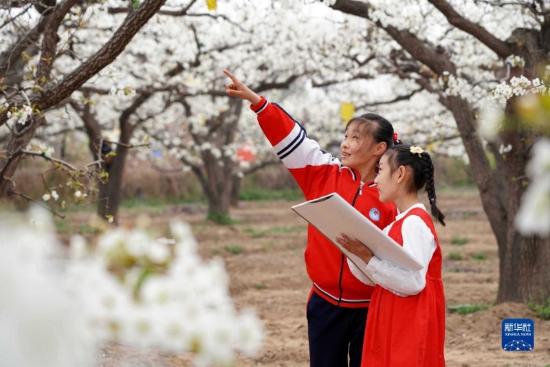 4月2日,小朋友在臨城縣北程村百年梨園寫生。