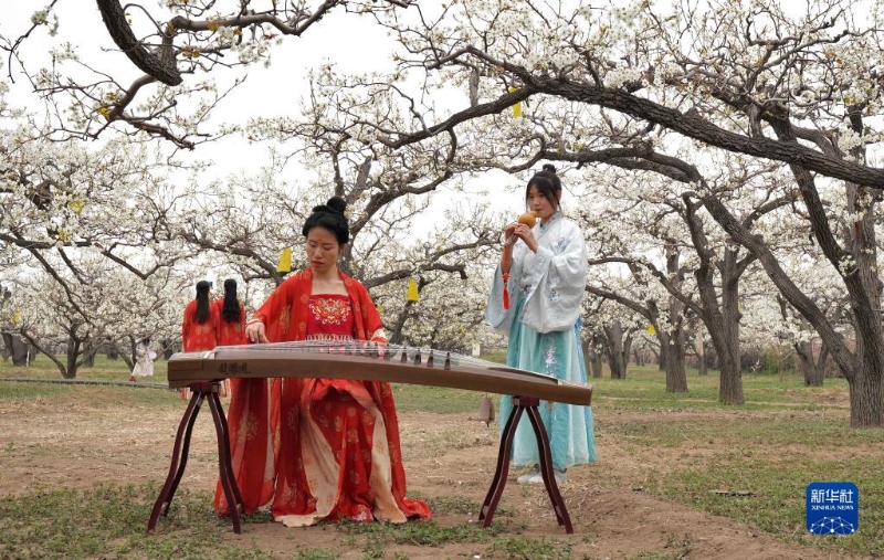 4月2日,在臨城縣北程村百年梨園舉行的梨花節(jié)主題活動上,音樂愛好者演奏樂器。