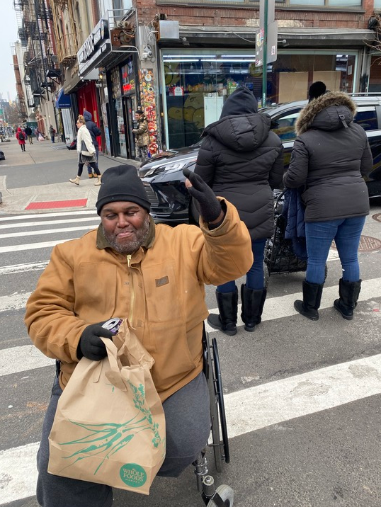 在美國另一端的東海岸,紐約市曼哈頓下城包厘街。已是上午10點半,中年男子普林斯·法克斯的早飯還沒有著落。他左腿膝蓋以下殘缺,坐在輪椅上,不停向行人招呼?!白鳛橐幻宋槔媳以诎ゐI,請救救我,求求你了!”