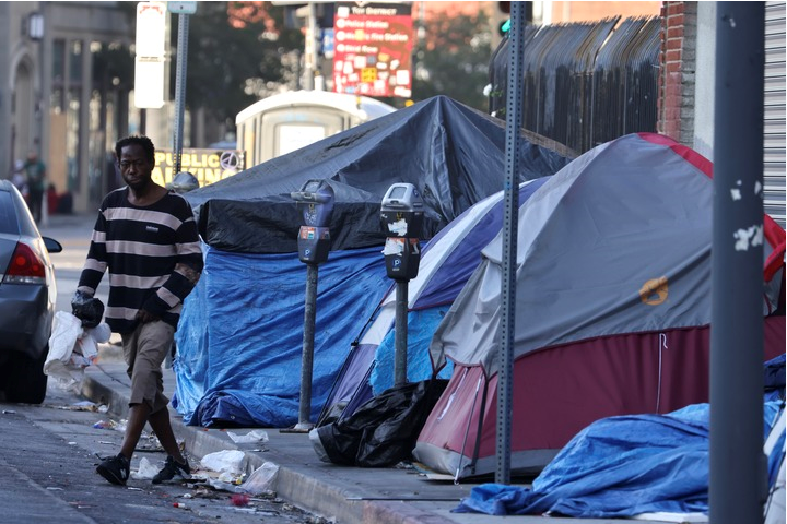 有著“天使之城”稱號的洛杉磯,全縣人口約1000萬,無家可歸者接近7萬人,兩個數(shù)字均位居全美第一。這些無家可歸者中,有部分人在政府或者福利機構(gòu)的收容所居住,但約70%不得不流落街頭,棲身于汽車、公園、廢棄建筑、公交車站、火車站、機場和露營地等。