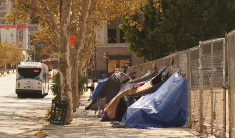 2022年9月8日,在美國加利福尼亞州洛杉磯市區(qū),街頭可見多個無家可歸者的帳篷。新華社發(fā)(曾慧攝)