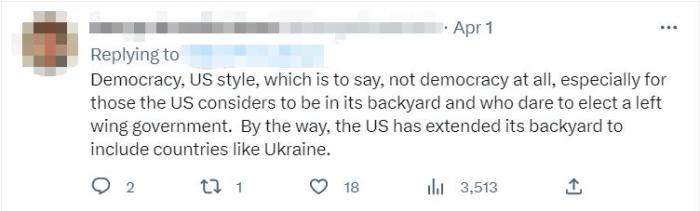 還有網(wǎng)友說,“美國式民主,換句話說,完全不是民主,特別是對于那些美國覺得是‘自家后院’的國家,以及那些膽敢選舉出左翼政府的國家來說。順便說一句,美國已經(jīng)把‘后院’延伸到像烏克蘭這樣的國家了?!?/p>