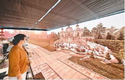 參觀者在欣賞數(shù)字技術(shù)模擬的圓明園景象。