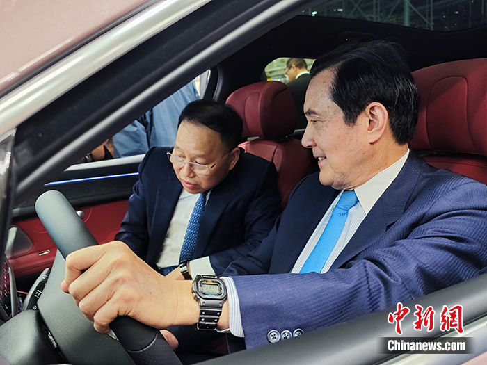 4月4日,馬英九一行在重慶參觀賽力斯汽車(chē)兩江智慧工廠。圖為馬英九坐上賽力斯與華為合作的新能源車(chē)體驗(yàn)。 中新社發(fā) 鐘欣 攝