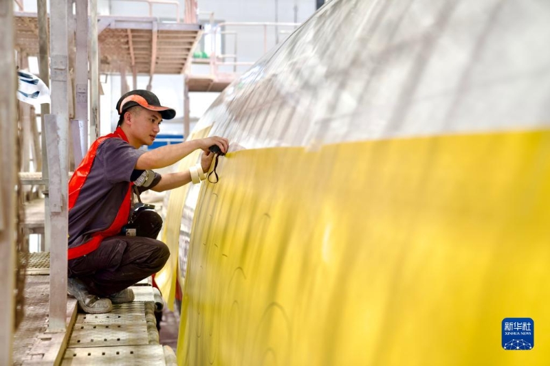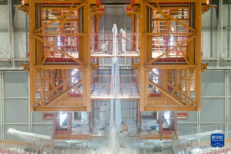 4月3日,在海南自貿(mào)港一站式飛機(jī)維修產(chǎn)業(yè)基地內(nèi),機(jī)務(wù)噴涂人員給進(jìn)境飛機(jī)安裝機(jī)身噴涂模板。