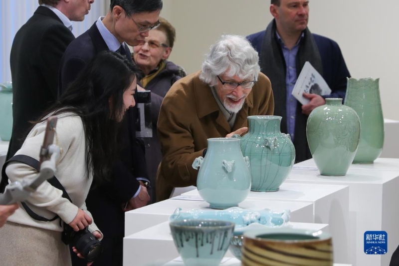 4月3日,在比利時(shí)布魯塞爾,參觀者在“聽瓷語 觀世界——宋韻龍泉青瓷展”上觀賞瓷器。