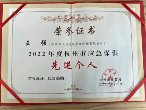 錢(qián)大媽深耕社區(qū)生鮮、立志為廣大消費(fèi)者提供高品質(zhì)生鮮食材,積極保供戰(zhàn)疫,確保防疫不松勁、供應(yīng)不斷檔。在抗疫保供的過(guò)程中,錢(qián)大媽人以高度的社會(huì)責(zé)任感與使命感投入到抗疫戰(zhàn)斗,沖在抗疫的最前線,不懼風(fēng)險(xiǎn)、勇挑重?fù)?dān)。錢(qián)大媽華東三區(qū)片區(qū)運(yùn)營(yíng)負(fù)責(zé)人王強(qiáng)先生在抗疫保供的過(guò)程中彰顯先鋒模范本色,榮獲“2022年度杭州市應(yīng)急保供先進(jìn)個(gè)人”。