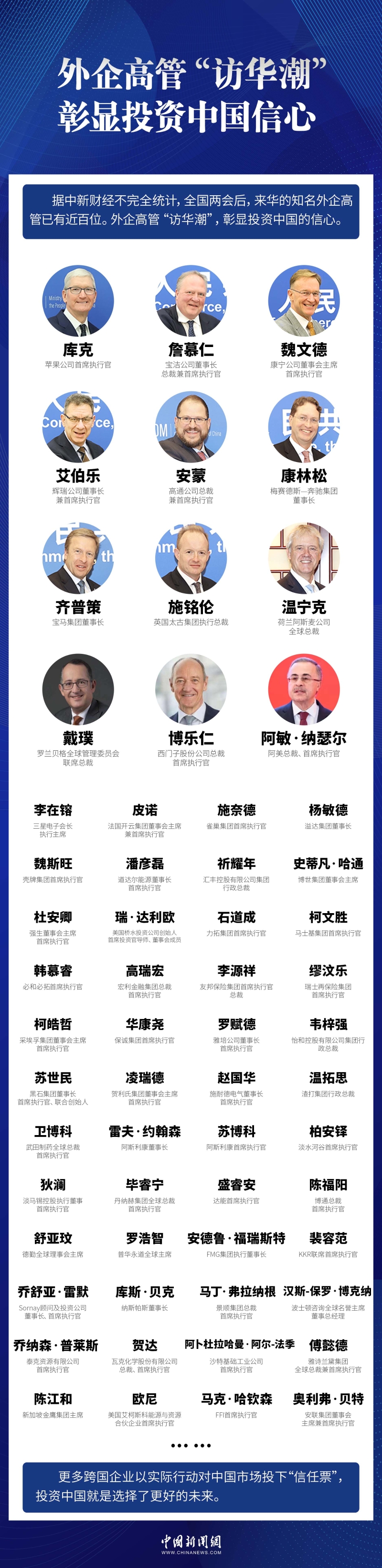時(shí)下,外企高管正掀起“訪華潮”。據(jù)中新財(cái)經(jīng)不完全統(tǒng)計(jì),全國兩會后,來華的知名外企高管已有近百位。