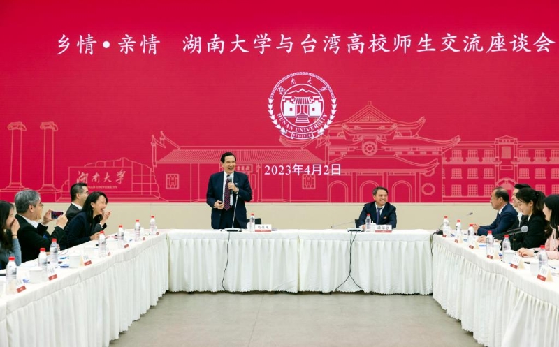 4月2日,在湖南大學(xué)國家超級計(jì)算長沙中心,馬英九先生(中左)帶領(lǐng)臺灣青年學(xué)生與湖南大學(xué)師生交流座談。新華社記者 才揚(yáng) 攝