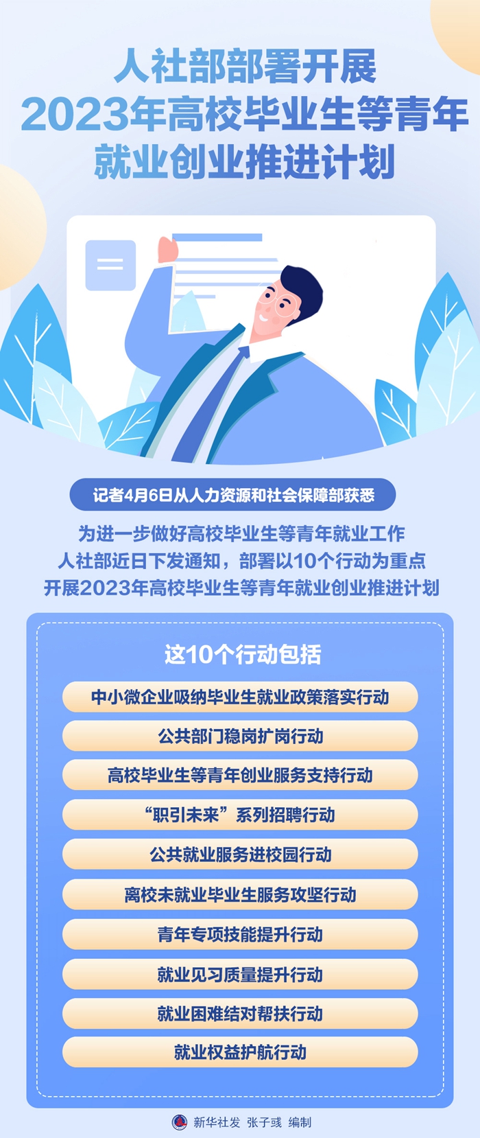 新華社北京4月6日電(記者姜琳)記者6日從人力資源和社會(huì)保障部獲悉,為進(jìn)一步做好高校畢業(yè)生等青年就業(yè)工作,人社部近日下發(fā)通知,部署以10個(gè)行動(dòng)為重點(diǎn),開(kāi)展2023年高校畢業(yè)生等青年就業(yè)創(chuàng)業(yè)推進(jìn)計(jì)劃。