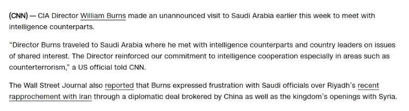 據(jù)美國有線電視新聞網(wǎng)報道,伯恩斯與沙特高級官員討論了“共同利益”,包括情報合作和反恐等問題?!度A爾街日報》文章稱,伯恩斯對沙特接受中國斡旋與伊朗復(fù)交、沙特與敘利亞走近等表示“失望”“錯愕”,重申伊朗和敘利亞仍處于美國的制裁中。
