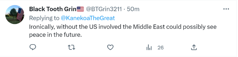 一名自我介紹是美國退役軍人的網(wǎng)友“現(xiàn)身說法”:“真諷刺,沒有美國摻和,中東或許未來就會實(shí)現(xiàn)和平。”