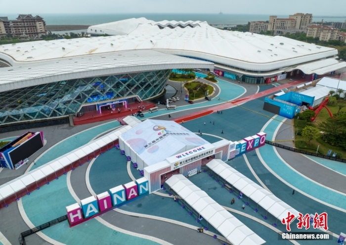 4月8日,第三屆中國國際消費品博覽會各參展商已完成展位的施工搭建工作,參展物品陸續(xù)上架。第三屆消博會將于4月10日至15日在位于海南省??谑械暮D蠂H會展中心舉辦。圖為第三屆中國國際消費品博覽會入口。(無人機照片)中新社記者 駱云飛 攝