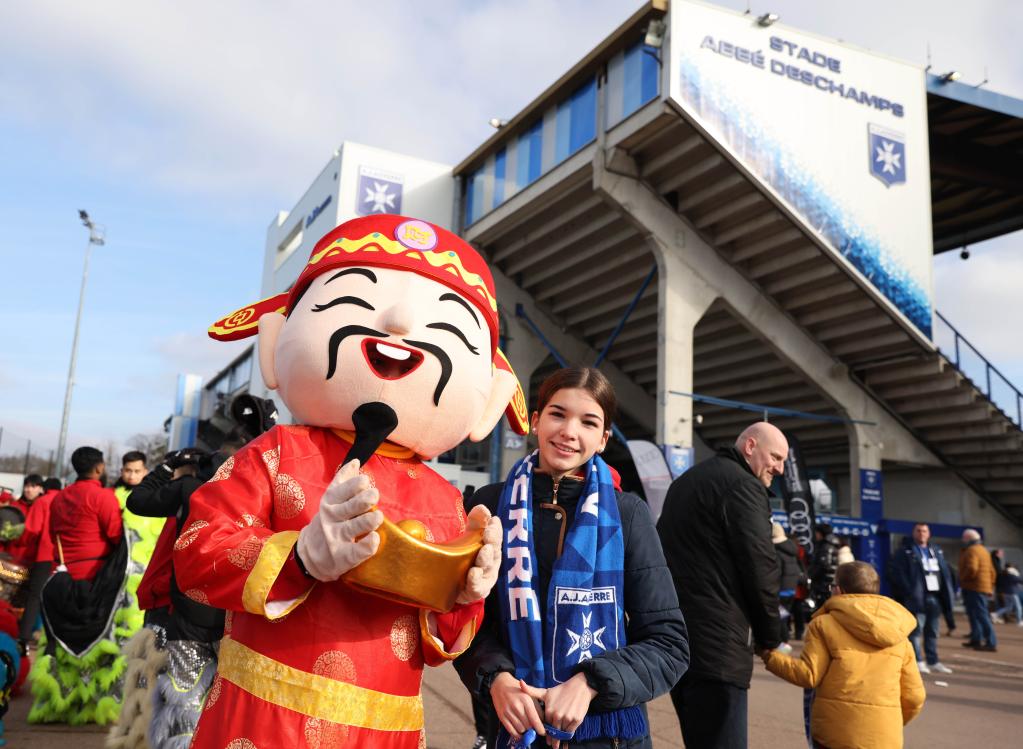 2023年1月29日,法甲舉辦“中國(guó)日”慶祝春節(jié),一名球迷與裝扮成“財(cái)神”造型的工作人員合影留念。