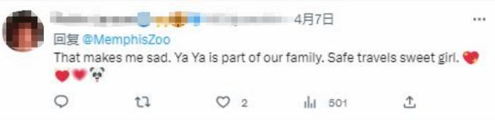 還有不少不能到現(xiàn)場的“丫丫”粉絲,在孟菲斯動物園社交媒體賬號下留言,用暖心的話語和“丫丫”說再見。