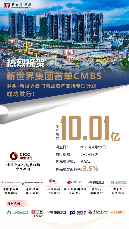 4月11日,新世界發(fā)展有限公司旗下的內(nèi)地物業(yè)旗艦新世界中國(guó),成功在深圳證券交易所發(fā)行國(guó)內(nèi)首單商業(yè)房地產(chǎn)抵押貸款支持證券(以下簡(jiǎn)稱“CMBS”)——“中金-新世界云門商業(yè)資產(chǎn)支持專項(xiàng)計(jì)劃”。該項(xiàng)目發(fā)行規(guī)模10.01億元,優(yōu)先級(jí)信用評(píng)級(jí)為AAAsf,發(fā)行票面利率3.5%,中國(guó)國(guó)際金融股份有限公司(以下簡(jiǎn)稱“中金公司”)擔(dān)任計(jì)劃管理人。此次CMBS的成功發(fā)行,標(biāo)志著新世界邁出了資產(chǎn)證券化重要的一步,彰顯了金融機(jī)構(gòu)及投資者對(duì)目標(biāo)項(xiàng)目和集團(tuán)綜合實(shí)力的高度信任和認(rèn)可,也為信用資本市場(chǎng)注入信心與動(dòng)力。