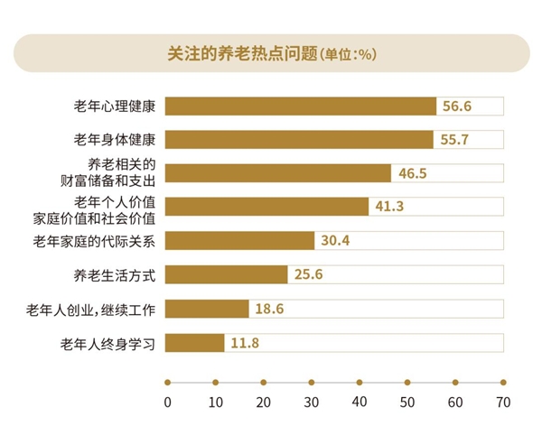 《中國城市養(yǎng)老服務(wù)需求報告2022》顯示,人口結(jié)構(gòu)和社會環(huán)境重構(gòu)養(yǎng)老觀念,城市居民以更加積極的心態(tài)看待“變老并且長期生存”,支持和擁抱積極老齡化。身心健康、財富儲備、價值體現(xiàn)、代際關(guān)系、生活方式等都是新時代城市居民關(guān)注的養(yǎng)老熱點(diǎn)問題。社會公眾希望通過提前為健康儲蓄、多元配置養(yǎng)老財富,老年階段能夠開啟“第二人生”,持續(xù)創(chuàng)造價值。