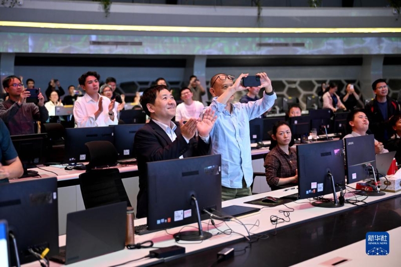 4月12日,在全超導(dǎo)托卡馬克核聚變實(shí)驗(yàn)裝置(EAST)控制大廳,科研人員在實(shí)驗(yàn)成功后慶祝。新華社記者 黃博涵 攝
