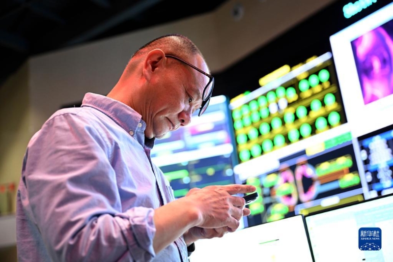 4月12日,EAST物理實(shí)驗(yàn)總負(fù)責(zé)人龔先祖注視著實(shí)驗(yàn)成功后的數(shù)據(jù)。新華社記者 張端 攝