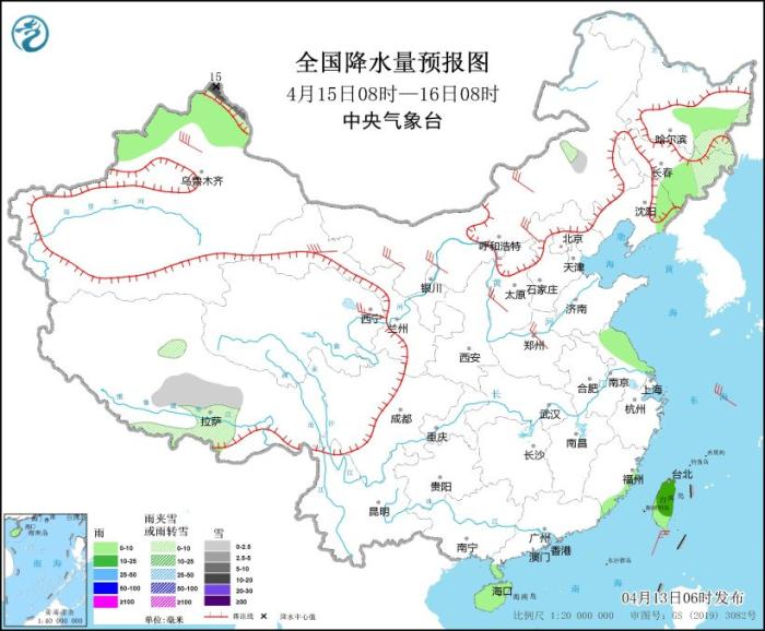 4月15日08時(shí)至16日08時(shí),黑龍江東南部、吉林東部、新疆北疆北部、西藏南部等地部分地區(qū)有小到中雪或雨夾雪,其中,新疆北疆北部局地有大到暴雪(10~15毫米)。黑龍江東部、吉林東部、遼寧東部、新疆北部、江淮東部、海南島、臺(tái)灣島等地部分地區(qū)有小雨,其中,臺(tái)灣島部分地區(qū)有中雨。內(nèi)蒙古中西部、西北地區(qū)中東部、華北大部等地部分地區(qū)有4~6級(jí)風(fēng),其中,新疆沿天山地區(qū)、甘肅河西等地部分地區(qū)有6~7級(jí)風(fēng)。東海北部海域?qū)⒂?~7級(jí)、陣風(fēng)8級(jí)的西北風(fēng),臺(tái)灣以東洋面將有5~7級(jí)、陣風(fēng)8級(jí)的東北風(fēng)。
