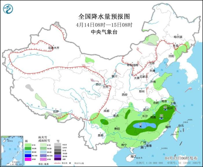 4月14日08時(shí)至15日08時(shí),內(nèi)蒙古東南部和中部、新疆北疆北部、西藏南部和西部等地部分地區(qū)有小雪或雨夾雪。吉林東部、西南地區(qū)東南部、黃淮東部、江淮西部、江南、華南大部等地部分地區(qū)有小到中雨,其中,湖南南部、江西中南部、福建西北部等地部分地區(qū)有大雨(25~45毫米)。內(nèi)蒙古大部、西北地區(qū)中東部、華北、黃淮等地部分地區(qū)有4~6級(jí)風(fēng),其中,甘肅河西部分地區(qū)有6~7級(jí)風(fēng)。東海北部海域?qū)⒂?~7級(jí)、陣風(fēng)8級(jí)的東南風(fēng)轉(zhuǎn)西南風(fēng)。