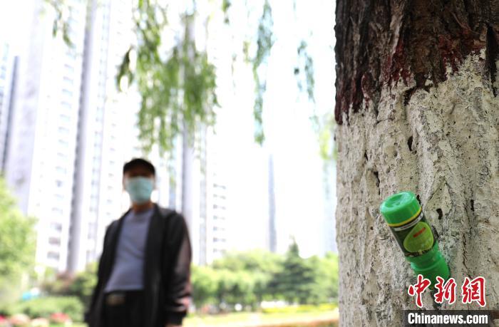 邯鄲市園林技術(shù)人員早在2015年就開始研制配方,在“抑花一號”化學粉劑的基礎上,加入一定比例的酒精和水,注入營養(yǎng)液袋后,通過針頭注入樹體。2016年通過瓶裝制劑赤霉素,在治理現(xiàn)場直接鉆孔“插瓶”即可使用。去年,經(jīng)過治理,該市飛絮量比2015年治理前減少了90%以上。