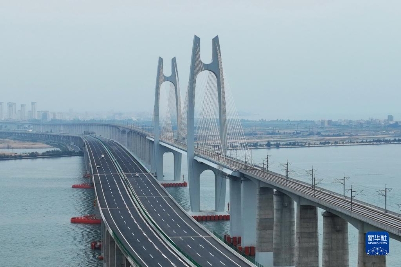 4月11日拍攝的新建福廈鐵路湄洲灣跨海大橋(無人機照片)。
