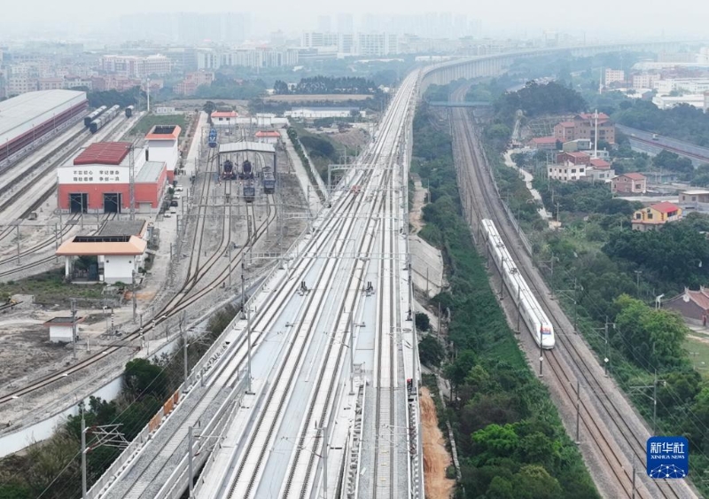 新建福廈鐵路廈門北進島聯(lián)絡(luò)線與杭深線(右)(4月12日攝,無人機照片)。