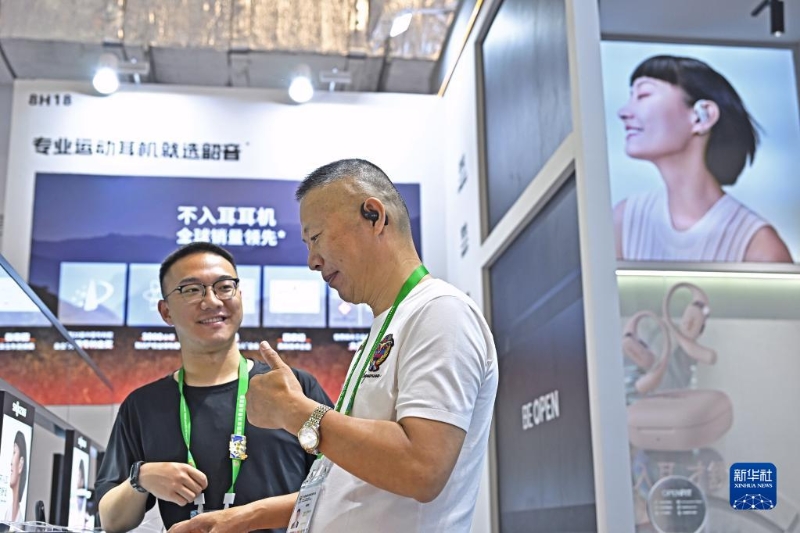 4月13日,一名參觀者在韶音展臺試聽該公司在消博會發(fā)布的新品不入耳藍(lán)牙耳機,并為產(chǎn)品點贊。