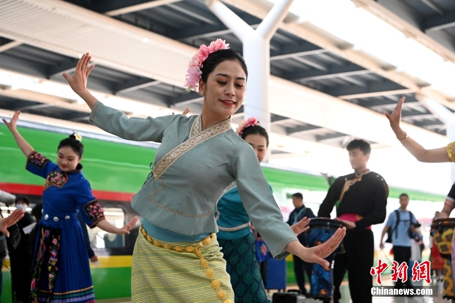 北京時間4月13日8時8分,D887次“復興號”動車組從中國昆明南站出發(fā),將于10小時30分后到達萬象站。北京時間9時8分,D888次“瀾滄號”動車組從老撾萬象站出發(fā),將在當日19時38分到達昆明南站。這標志著中老鐵路國際旅客列車正式開行,中國昆明和老撾萬象之間實現(xiàn)朝發(fā)夕至。圖為身著民族服飾的列車員為旅客帶來特色節(jié)目。中新社記者 李嘉嫻 攝