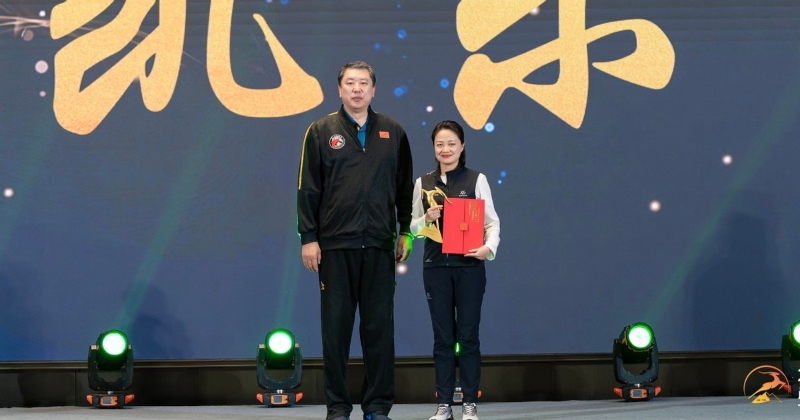 浙江省寧波市體育局黨組書記、局長、體育總會主席張霓為“金羚羊”傳播獎獲獎紀(jì)錄片《雅荻跑世界》頒獎