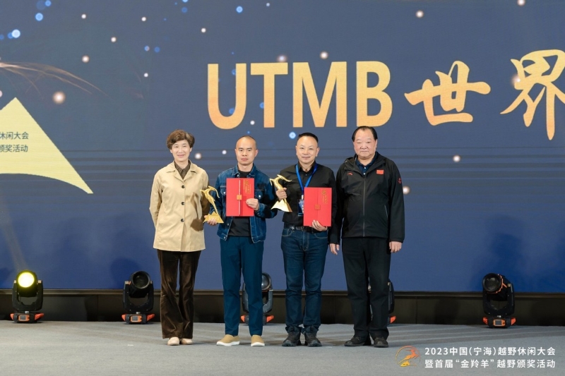 中國社會體育指導(dǎo)員協(xié)會會長邱汝、中國奧運(yùn)首金獲得者許海峰為“金羚羊”國際交流獎獲得者金飛豹、費(fèi)宣及UTMB系列賽頒獎