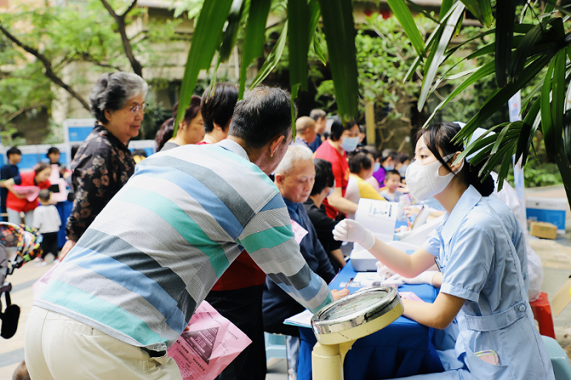 壹邦義診現(xiàn)場(chǎng),護(hù)士為居民測(cè)量血壓、血糖等
