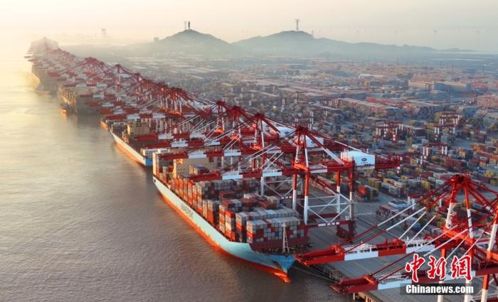 資料圖:4月1日,上海,橋吊林立的上海港洋山深水港碼頭,多艘超大型集裝箱貨船正在進行集裝箱裝卸作業(yè),碼頭作業(yè)繁忙有序。