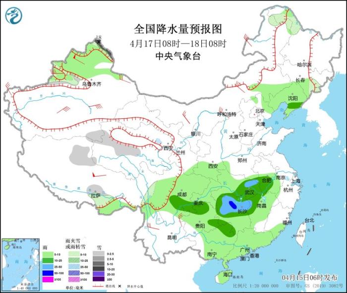 4月17日08時至18日08時,新疆北疆東北部和伊犁河谷及沿天山地區(qū)、內(nèi)蒙古東北部、黑龍江西北部、西藏北部、青海西部等地部分地區(qū)有小雪或雨夾雪,其中,新疆阿勒泰北部等地部分地區(qū)有大到暴雪(10~18毫米)。江漢東部、江南西部和北部、四川盆地南部、廣西東北部等地部分地區(qū)有中到大雨,其中,湖南中北部等地部分地區(qū)有暴雨。內(nèi)蒙古中西部、新疆大部、西藏中西部等地部分地區(qū)有4~6級風,其中,新疆西部和南部、西藏中部等地部分地區(qū)有6~8級風(見圖4)。