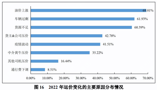 《報(bào)告》中提到,運(yùn)價(jià)變化的三個(gè)主要原因分別是:油價(jià)上漲、車輛過剩加劇市場低價(jià)競爭、貨源不足拉低整體價(jià)格。首先,油價(jià)上漲成為最大成本推手。69.01%的貨車司機(jī)反映2022年造成運(yùn)價(jià)變化的主要原因?yàn)橛蛢r(jià)上漲。2022年平均油價(jià)上漲幅度約3成,如果按照燃油成本占物流企業(yè)運(yùn)輸總成本30%計(jì)算,總運(yùn)輸成本上漲了約10%。