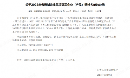 廣東省制造業(yè)單項(xiàng)冠軍是指長(zhǎng)期專注于制造業(yè)細(xì)分行業(yè)產(chǎn)品研發(fā)和生產(chǎn),具備較好的創(chuàng)新基礎(chǔ)條件和較強(qiáng)的技術(shù)創(chuàng)新能力,生產(chǎn)技術(shù)或工藝達(dá)到國(guó)際領(lǐng) 先水平,單項(xiàng)產(chǎn)品市場(chǎng)占有率位居全球或國(guó)內(nèi)行業(yè)前列的制造業(yè)企業(yè)或工業(yè)產(chǎn)品。培育制造業(yè)單項(xiàng)冠軍,是推動(dòng)制造業(yè)高質(zhì)量發(fā)展的重要內(nèi)容之一。其旨在引導(dǎo)制造業(yè)企業(yè)專注創(chuàng)新和產(chǎn)品質(zhì)量提升,推動(dòng)產(chǎn)業(yè)向中高端發(fā)展,提升制造業(yè)國(guó)際競(jìng)爭(zhēng)力,并帶動(dòng)中國(guó)制造走向世界。