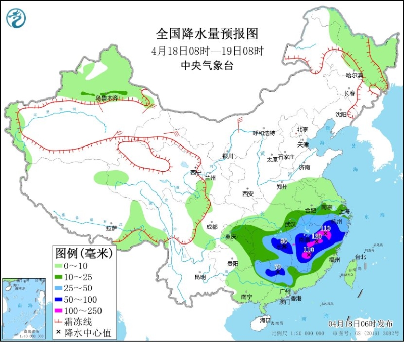 4月18日08時至19日08時,新疆北疆北部和沿天山地區(qū)、內(nèi)蒙古東北部、黑龍江西北部等地部分地區(qū)有小到中雪或雨夾雪,其中,新疆沿天山高海拔地區(qū)有大雪或暴雪;廣西東北部、廣東北部、湖南東部和南部、安徽南部、江西大部、浙江大部、福建西部等地部分地區(qū)有大到暴雨,其中,江西東部、浙江西南部、福建西北部等地局地有大暴雨(100~130毫米)。新疆東部和北部、甘肅北部、內(nèi)蒙古中東部、黑龍江西南部等地部分地區(qū)有5~7級風。