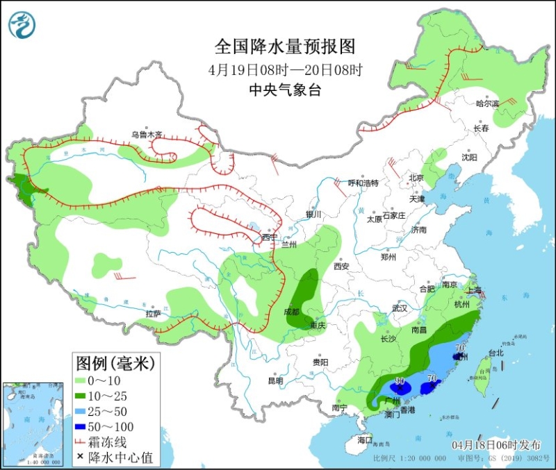 4月19日08時至20日08時,新疆南疆盆地西部山區(qū)與沿天山高海拔地區(qū)、西藏北部和西部等地部分地區(qū)有小到中雪或雨夾雪;廣東中東部、江西南部、福建大部、浙江南部等地部分地區(qū)有中到大雨,其中,福建南部、廣東中部和東部等地局地有暴雨(50~90毫米)。新疆南部、內(nèi)蒙古、東北地區(qū)、河北北部等地部分地區(qū)有5~7級風。